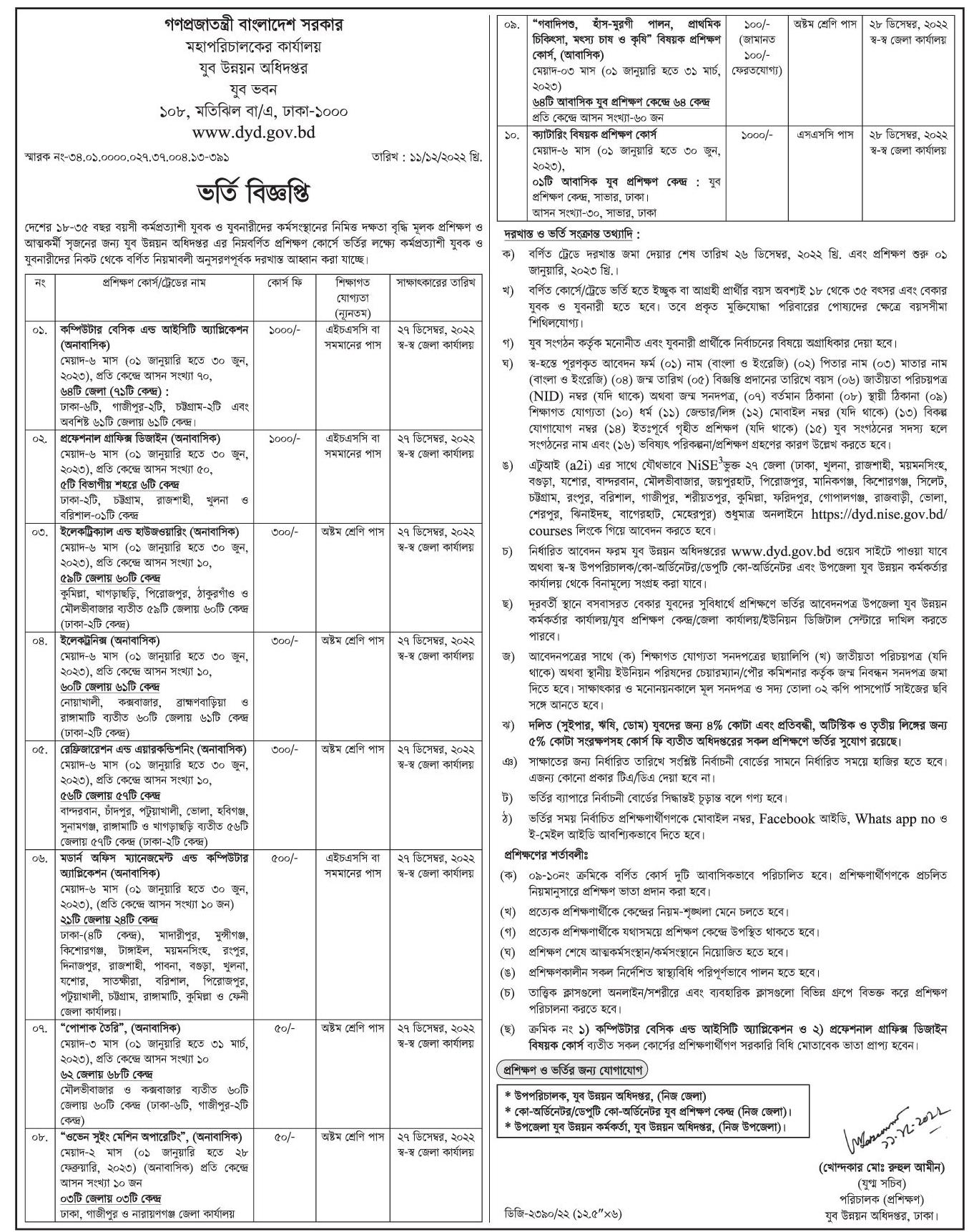 Department Of Youth Development Training Program Admission Circular 2022 for application link click here